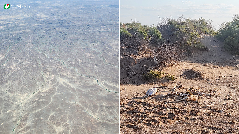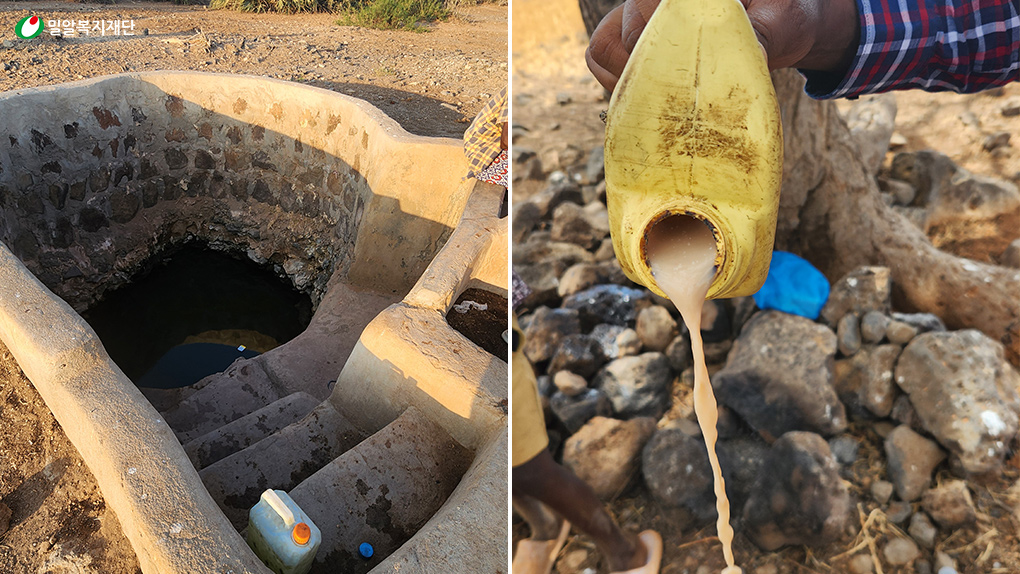 (Left) A dried-up well due to drought / (Right) Water mixed with milk, taken in place of a meal